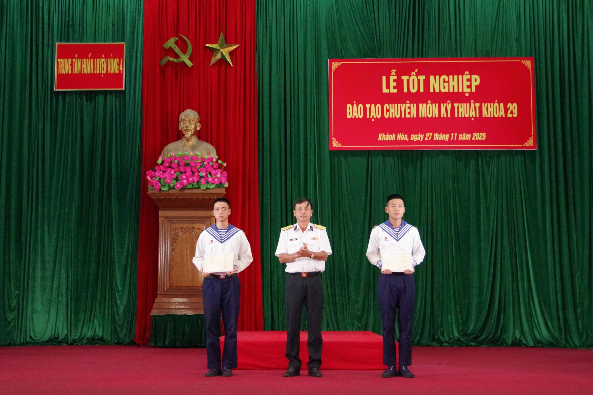 Chiều 27-11, Trung tâm Huấn luyện Vùng 4 Hải quân tổ chức lễ tốt nghiệp đào tạo chuyên môn kỹ thuật sơ cấp khóa 29, đối tượng 5 tháng. Đại tá Bùi Quang Thuyên - Phó Tư lệnh Vùng 4 dự, chỉ đạo.