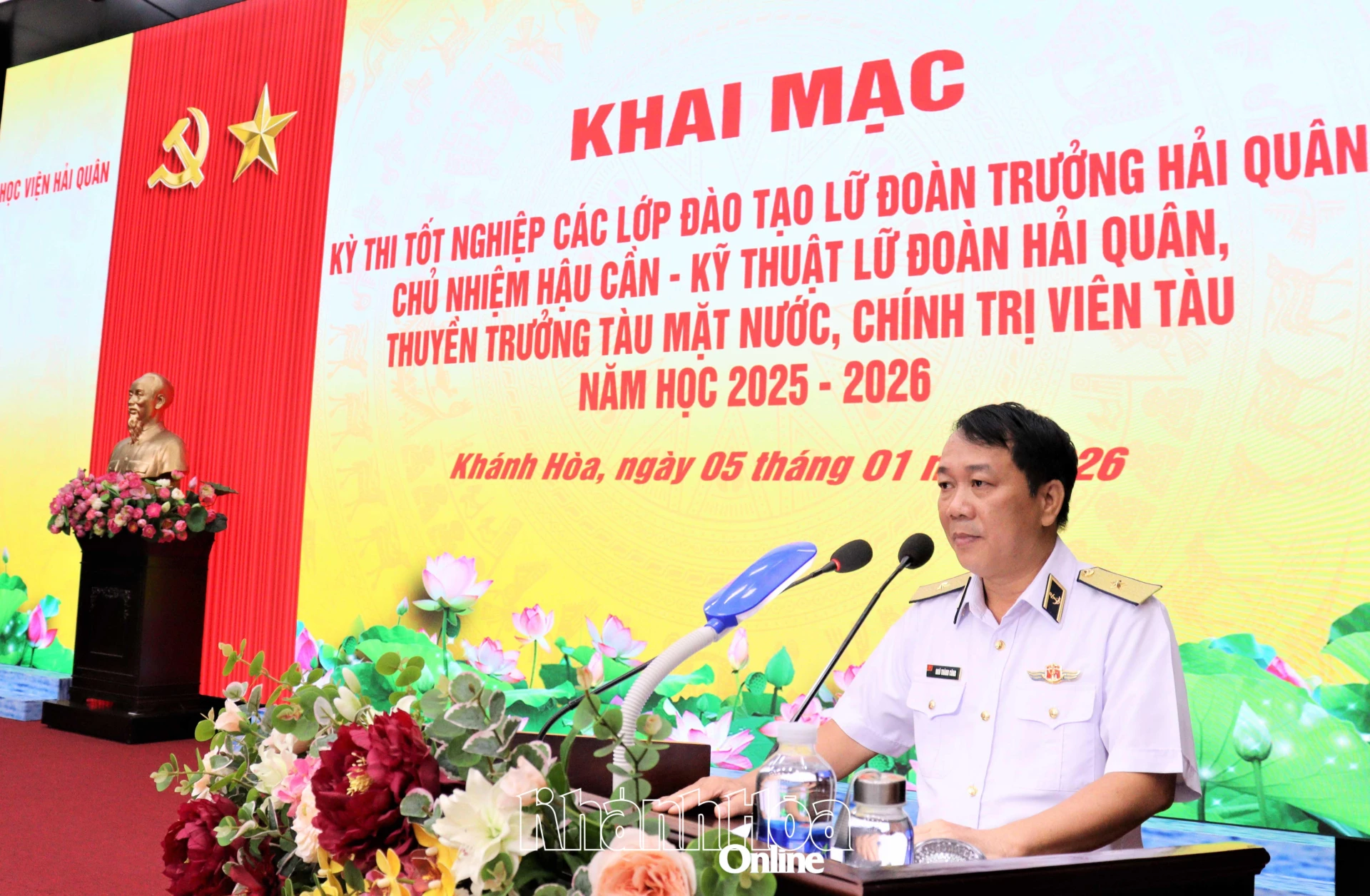 Ngày 5-1, Học viện Hải quân tổ chức khai mạc kỳ thi tốt nghiệp các lớp đào tạo Lữ đoàn trưởng hải quân khóa 34, Chủ nhiệm Hậu cần - Kỹ thuật Lữ đoàn hải quân khóa 15, Thuyền trưởng tàu mặt nước khóa 25, Chính trị viên tàu khóa 31, năm học 2025 - 2026. Chuẩn Đô đốc, PGS.TS Ngô Thành Công - Giám đốc học viện chủ trì; dự khai mạc có Chuẩn Đô đốc Nguyễn Hữu Thoan - Chính ủy học viện.