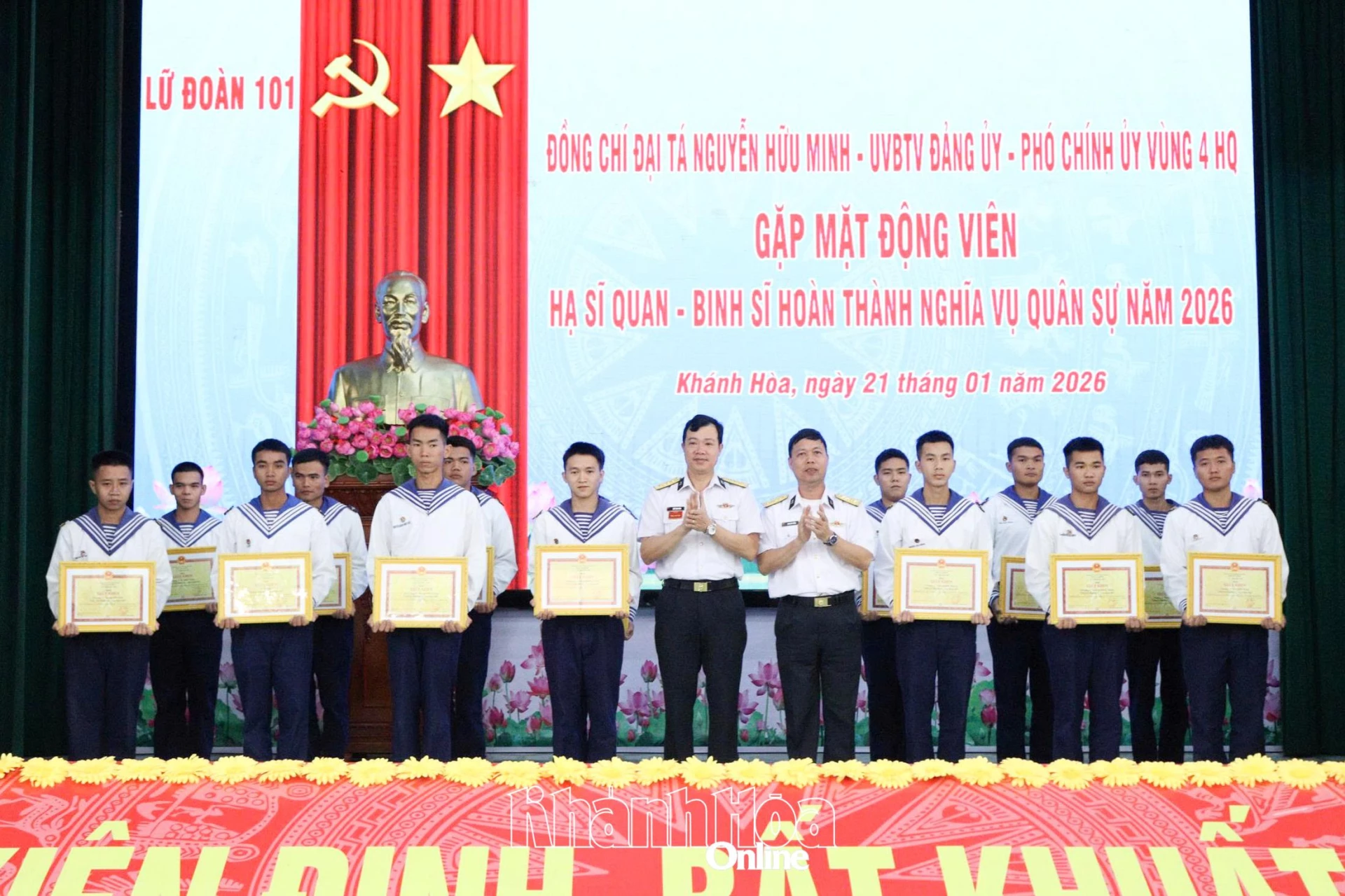Ngày 21-1, Lữ đoàn 101, Vùng 4 Hải quân tổ chức gặp mặt, động viên hạ sĩ quan, chiến sĩ hoàn thành nghĩa vụ quân sự năm 2026. Đại tá Nguyễn Hữu Minh - Phó Chính ủy Vùng 4 Hải quân đến dự.
