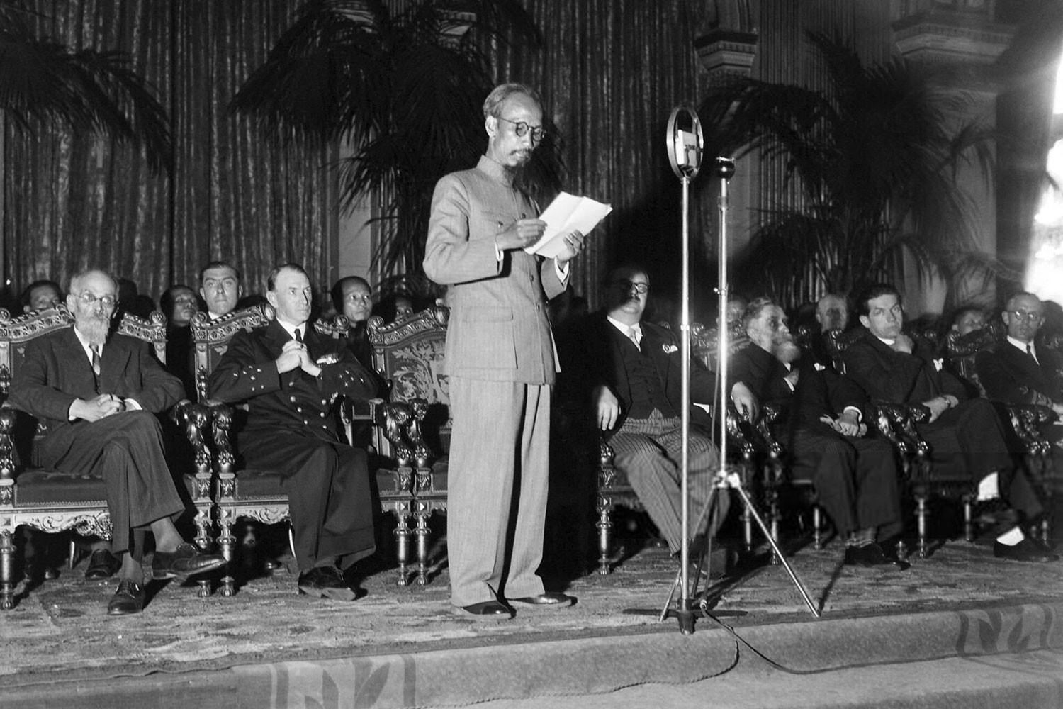 | Chủ tịch Hồ Chí Minh phát biểu tại Tòa thị chính Paris ngày 6/7/1946. |