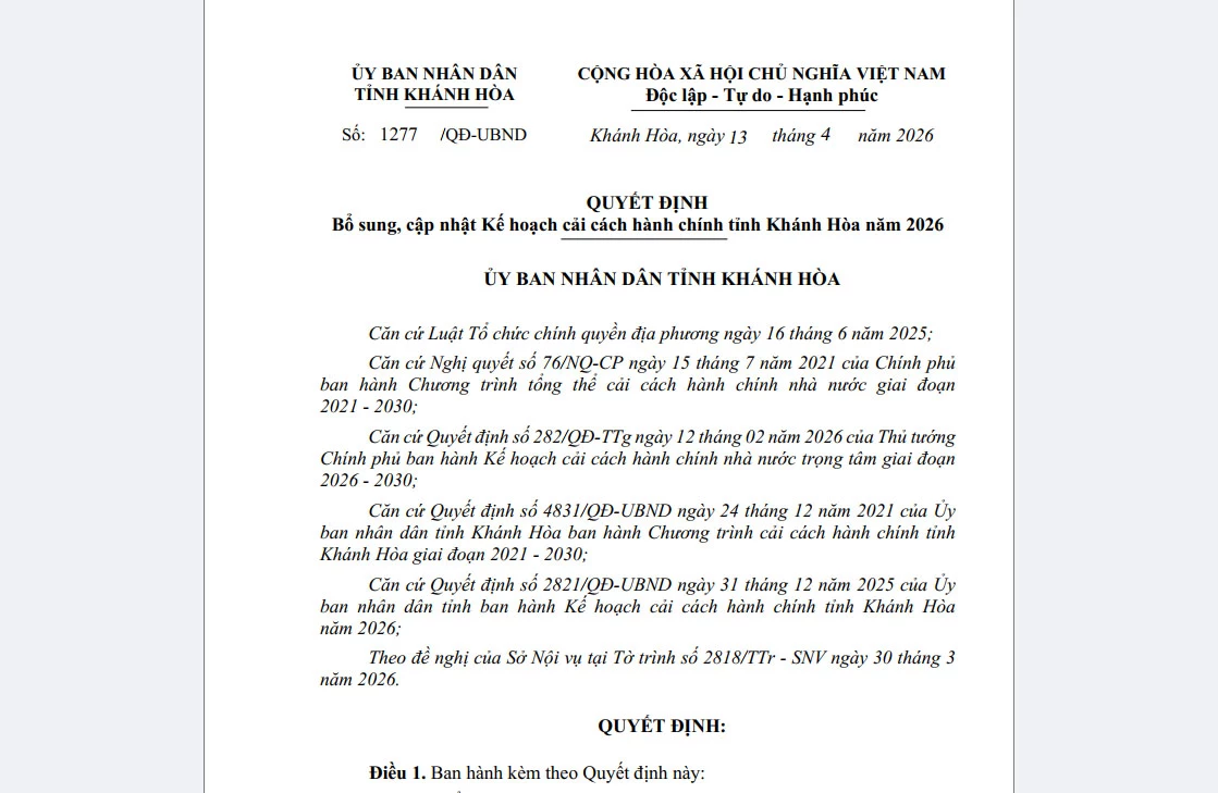 Ngày 13-4, UBND tỉnh Khánh Hòa ban hành Quyết định bổ sung, cập nhật kế hoạch cải cách hành chính (CCHC) năm 2026, trong đó cập nhật, bổ sung danh mục các chỉ tiêu và nhiệm vụ CCHC trọng tâm.