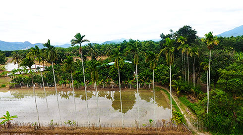 Hàng cau in bóng trên cánh đồng vùng quê Diên Khánh.