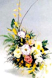 - Cắm rễ lan bò cạp buông tự nhiên xuống mặt bình. Những hoa còn lại cắm nương theo dáng tạo sẵn. Xen kẽ hoa hồng đỏ vào. Cắm lan vũ nữ theo đường chéo. Xen baby ở giữa. Đệm thêm kim thủy tùng.