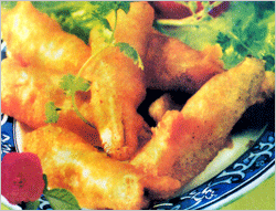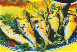 Cá trích tươi nhúng qua bột, chiên giòn. Món cá ăn kèm tương ớt.