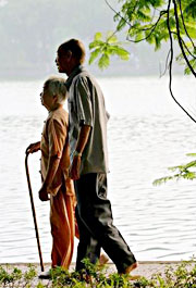 Cụ ông Bảy Hận năm nay đã 80, còn cụ bà cũng qua tuổi “xưa nay hiếm”. Vậy mà sáng nào, tôi cũng thấy 2 cụ dắt nhau đi dạo trên con đường quanh nhà. Tuy cụ bà ít hơn cụ ông 8 tuổi nhưng cụ ông lại khỏe hơn. Sau 1 lần tai biến mạch máu não, cụ bà bị liệt một tay, một chân. Vậy mà nhờ cụ ông động viên, giúp đỡ tập luyện nên cụ bà nay đã đi được. Gia đình 2 cụ chỉ có một người con, lại ở xa. Có lần, người con đã thuê cho các cụ một ô-sin, nhưng cụ bà không ưng ý. Lúc bệnh thuyên giảm, cụ tự tay chăm sóc cho mình và lo cơm nước cho cụ ông. Nhiều lúc cụ ông không cho, bảo: “Bà để tôi làm. Lúc trẻ tôi không lo cho bà được nhiều, nay tôi lo bù. Bà tranh thủ đọc mấy tờ báo đi cho đỡ buồn”, cụ bà cảm thấy rất vui.