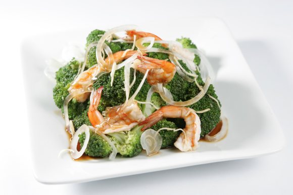 - Bày món ăn: Đầu tiên, xếp bông cải ra dĩa, xếp tôm lên trên, cho những khoanh hành tây lên, rưới nước xốt và cuối cùng là rắc gừng băm lên trên.