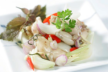 - Thịt ếch rất hợp vị với rau răm, sả, ớt, ngò om (rau ngổ) và tía tô.