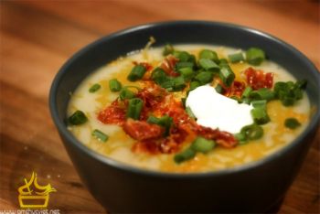 - Nấu và khuấy mạnh tay cho đến khi xúp nóng. Đổ ra tô, rắc 1 ít thịt xông khói, hành lá, tiêu xay trang trí và dùng nóng.