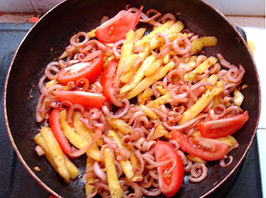 Mực khô, dứa, cà chua, hành khô, bột nêm & tiêu.