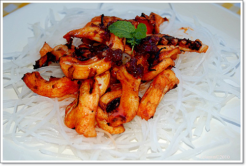 Bạch tuộc cắt lát mỏng vừa ướp với gừng, tỏi, ớt, dầu ăn và bột nêm cho thấm khoảng 15 phút.