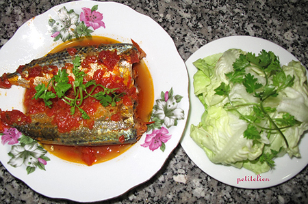 Dọn cá rắc tiêu và ngò, dùng salad chấm với cá kho rất ngon.