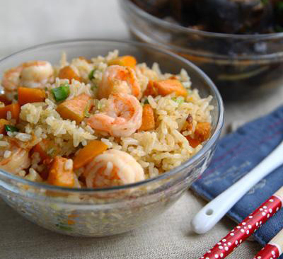 Cơm rang có thể được kết hợp với rất nhiều loại nguyên liệu. Hôm nay mình tận dụng tôm và bí đỏ sẵn có trong tủ lạnh.