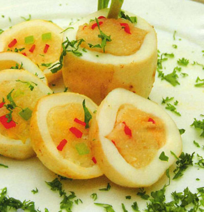 2. Cắt mực thành khoanh, trang trí ra đĩa. Mực nhồi xôi ăn với tương ớt.