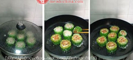 - Nhồi thịt đã ướp vào từng khoanh mướp đắng, và đem đi rán vàng hai mặt