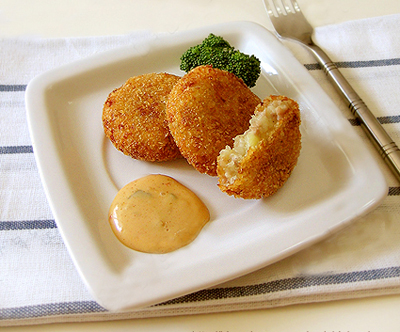 Nặn thành nhiều viên tròn, ấn dẹp. Lăn bánh qua bột mỳ, nhúng vào trứng rồi lăn qua bột chiên xù.