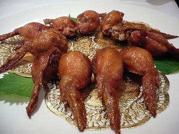 - Ướp phần cánh đã được nhồi này với dầu hào+xì dầu+hắc xì dầu+muối+tiêu xay và ít đường cho thấm gia vị, dùng chảo không dính cho ít dầu vào, chiên cánh gà cho chín, nếu không dùng nhiều dầu để chiên, thì khi chiên dậy nấp để lửa nhỏ và nhớ trở hai mặt cho đều, làm như vậy cánh gà sẽ chín kỹ và không cần dùng nhiều dầu. Khi cánh gà chín, cho ra ngoài phết mật ong lên lớp da gà, sau đó chiên sơ lại là được, cho ra đĩa, món này dùng với đồ chua hoặc dưa leo,cà chua đều ngon.