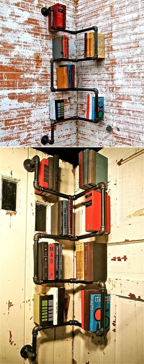 Khi những đoạn ống nước thô cứng biến thành chiếc giá sách, bạn sẽ phải ngạc nhiên về các tác dụng lưu trữ cũng như tính thẩm mỹ của chúng. Chất liệu ống thép gắn nơi góc tường giúp bạn tha hồ xếp những bộ sách nặng mà không phải lo lắng về không gian lắp đặt cũng như độ bền. Ngoài ra, chiếc giá sách làm từ ống nước còn đem lại cho chủ nhân cảm giác vừa cổ điển, vừa mới mẻ về đô thị hiện đại.