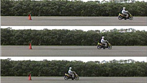 Khoảng cách dừng xe cũng khác nhau với các cách dùng phanh xe khác nhau. Hãy quan sát hình ảnh dưới đây, từ trên xuống dưới là các cách chỉ dùng phanh sau, chỉ dùng phanh trước và dùng cả hai phanh.