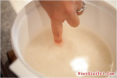 Đổ nước vào. Đặt ngón tay trỏ sạch của bạn vào nồi cơm, đổ nước nấu cơm, mực nước được tính từ đầu ngón tay chạm vào gạo đến hết đốt đầu tiên của ngón tay trỏ. (Đốt ngón tay trỏ này được tính đối với bàn tay phụ nữ thông thường, nếu tay bạn to hơn nhiều thì dùng đốt đầu tiên của ngón út để đo mực nước)