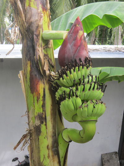 Mấy ngày nay, nhà anh Trần Tiến Khương (số 158/14 đường Hương lộ Ngọc Hiệp, phường Ngọc Hiệp, TP. Nha Trang, Khánh Hòa) bỗng nhiên có đông người hiếu kỳ đến xem buồng chuối trổ giữa thân cây, hoa chuối chốc ngược lên trời (xem ảnh).