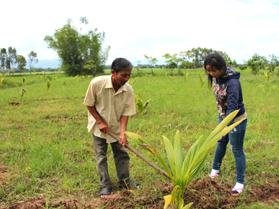 | Cán bộ Trung tâm Khuyến nông - Khuyến ngư tỉnh (bên phải) hướng dẫn cho nông dân kỹ thuật trồng dừa xiêm dây. |