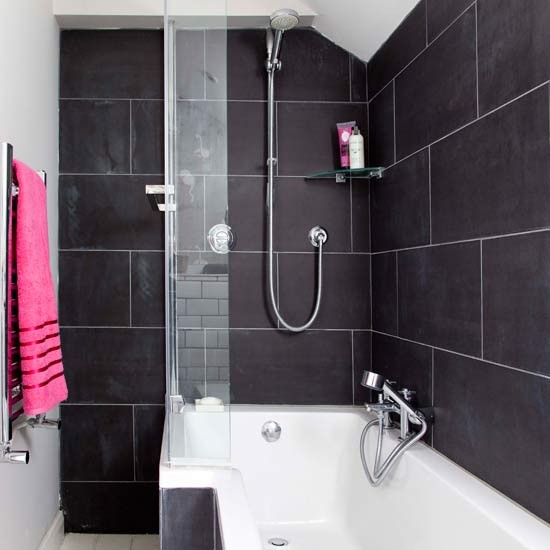 Một trong những giải pháp hữu hiệu để giúp phòng tắm nhỏ trở nên rộng rãi hơn chính là sử dụng gạch ốp tường loại to bản cho mặt sàn và tường. Càng ít đường phân tách giữa các viên gạch sẽ càng tạo ra ảo giác về một không gian rộng rãi hơn thực tế. Bên cạnh đó, nếu không đủ diện tích để xây một bồn tắm đứng riêng biệt, bạn có thể bố trí thêm vòi hoa sen ngay tại khu bồn tắm như phòng tắm dưới đây.