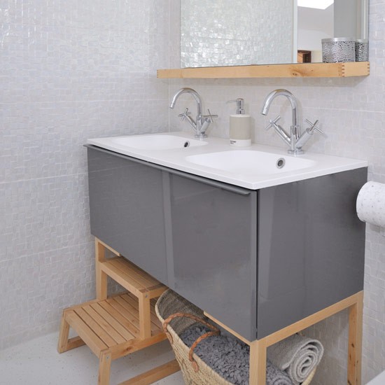 Thay vì việc kê nội thất trực tiếp xuống sàn, bàn có thể kê chúng lên giá kệ để giải phóng bề mặt sàn hiệu quả hơn. Chẳng hạn như ở phòng tắm này, chiếc bồn rửa mặt đôi được đặt lên giá gỗ vừa đảm bảo được yêu cầu sử dụng của các thành viên trong gia đình, vừa tận dụng được không gian dưới gầm để lưu trữ đồ đạc.