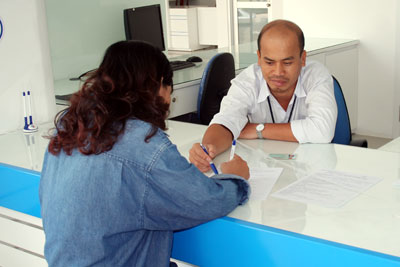 | Nhân viên dịch vụ khách hàng hướng dẫn khách hàng đăng ký dịch vụ MyTV. |