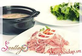 Cho nồi nước lẩu lên bếp cồn, dọn thịt bò, rau, bún ở xung quanh. Nước lẩu sôi, trụng thịt bò và rau đến đâu dùng đến đó.