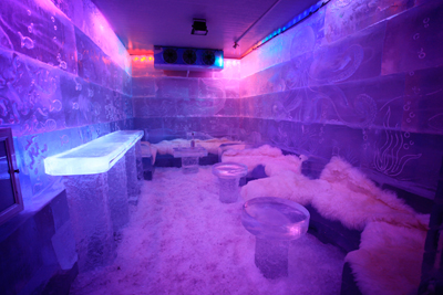 Chiếc bàn, quầy bar đều được làm từ băng. |