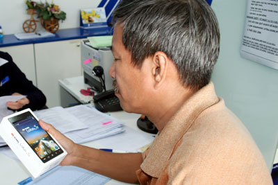 | Khách hàng chon mua điện thoại thông minh Vivas Lotus S1 tại một điểm giao dịch của VNPT Khánh Hòa. |