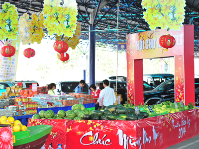 Chợ Tết được bố trí khu vực phía trước trung tâm. Tại đây, hơn 100 mặt hàng phục vụ dịp Tết được bày bán như bánh kẹo, mứt, hoa quả... Trái cây nhiều chủng loại gồm: xoài cát Hòa Lộc, quýt tiêu miền Tây, khóm Long An, bưởi hồng da xanh, bưởi Năm Roi, dưa lưới Tú Thanh, dưa không hạt, mãng cầu, thanh long…Đặc biệt, sản phẩm mâm ngũ quả lần đầu có mặt tại Metro.