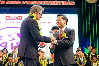 | Tổng Giám đốc AIA Việt Nam (bên trái) nhận giải thưởng Rồng Vàng lần thứ 8. |