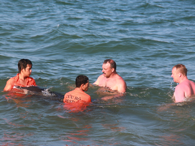 Chiều 10-4, người dân và du khách nước ngoài chứng kiến hai nhân viên cứu hộ của Ban quản lý Vịnh Nha Trang cứu hộ thành công một chú cá heo bị dạt vào bờ, ngay trước khách sạn Sunrise.