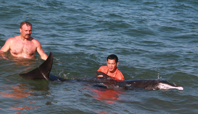 Hai nhân viên cứu hộ tận tình cứu chú cá heo. |