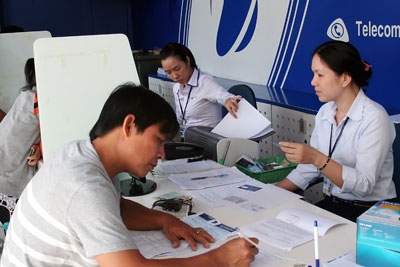 | Nhân viên giao dịch Trung tâm Viễn thông Cam Ranh hướng dẫn khách hàng đăng ký thông tin thuê bao di động trả trước của Vinaphone. |