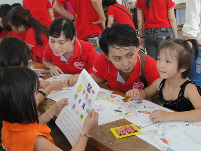 Các thành viên trong đoàn dạy vẽ cho các em thiếu nhi |