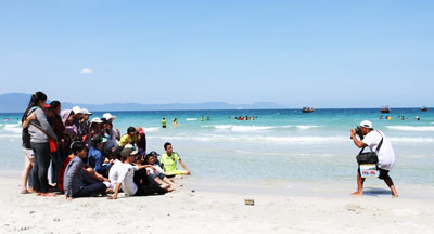 Đang ăn cơm trưa, thấy một đoàn khách du lịch tiến vào bãi tắm, anh Hải (xã Ninh Thủy, thị xã Ninh Hòa) - thợ chụp ảnh - vội thu xếp tư trang đến mời khách chụp hình làm kỷ niệm. Sau một hồi thuyết phục, khách cũng chấp nhận chụp vài kiểu ảnh rửa ép khung lấy liền. Anh Hải cho biết: “Trung bình mỗi ngày, tôi kiếm khoảng 250 - 500 nghìn đồng từ việc chụp ảnh cho khách du lịch, hôm nào trúng mánh thì được hơn 1 triệu đồng, thu nhập khá hơn làm nghề chính hay đi biển nhiều”. Được biết, công việc chính của anh là công nhân đan ghế ở một công ty xuất khẩu. Vào những tháng hè, anh tranh thủ làm nghề tay trái này để kiếm thêm thu nhập.