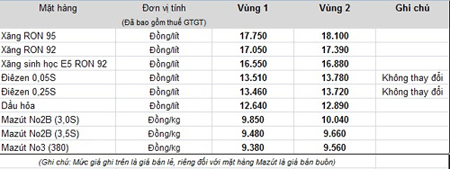 Sau khi thực hiện trích lập Quỹ Bình ổn giá, điều chỉnh giá các mặt hàng xăng dầu. Cụ thể: Xăng RON 92 và E5 giảm 178 đồng/lít, dầu mazut 180CST 3.5S giảm 83 đồng/kg, riêng giá dầu hỏa tăng 124 đồng/lít.