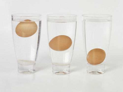 Khi bạn thả quả trứng vào một cốc nước, nếu trứng mới, nó sẽ chìm xuống, còn trứng cũ, nó sẽ nổi lên trên, trứng lơ lửng khi nó đã bớt tươi. Hay nói cách khác, trứng càng mới thì càng chìm sâu sát đáy.