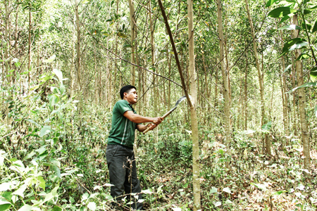 | Ông Bo Bo Quốc Hưng đang tranh thủ chăm sóc vườn keo của gia đình |