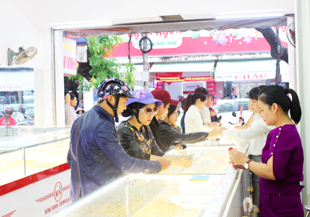 Tại các cửa hàng kinh doanh vàng trên đường Ngô Gia Tự như: Kim Chung, Kim Thanh Lịch, Kim Vinh… những ngày này đã tấp nập khách hàng. Theo ông Nguyễn Hùng Vinh - chủ cửa hàng kinh doanh vàng Kim Vinh, trước Tết, ông đã đặt mua gần 1.000 miếng vàng loại 1 chỉ SJC để phục vụ khách hàng trong ngày vía Thần Tài. Tuy chưa đến ngày vía Thần Tài, nhưng hiện nay số lượng khách đến mua sản phẩm này đã tăng lên đáng kể. Năm trước, vào dịp này, doanh thu của cửa hàng Kim Vinh đạt khoảng 5 tỷ đồng. Dự đoán năm nay, doanh thu sẽ cao hơn năm ngoái, một phần do tín ngưỡng của người dân và giá vàng trên thế giới đang tăng cao hơn so với trước Tết. “Những năm trước, phần lớn khách hàng thường đợi đến ngày mùng 10 mới đi mua. Nhưng năm nay, một số người sợ ngày đó bận việc hoặc ngại đông đúc nên đã mua trước mấy ngày nay. Do đó, từ sau Tết đến nay, cửa hàng lúc nào cũng đông khách”, ông Vinh nói.