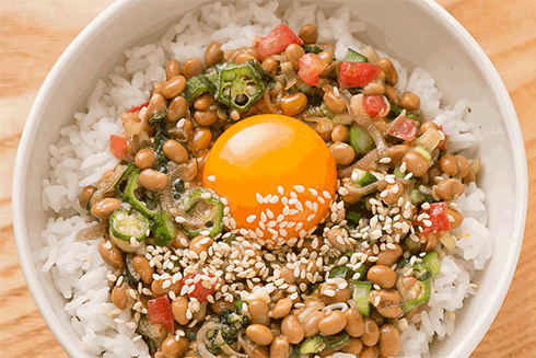 Natto (đậu tương lên men của Nhật Bản) và trứng đều là những nguyên liệu rất bổ dưỡng, trộn chúng với nhau có vẻ sẽ khiến món natto trở nên ngon hơn. Trứng giàu chất dinh dưỡng như thế nào chúng ta đều đã biết, trong khi đó natto rất giàu biotin, một chất không thể thiếu để chuyển hóa chất béo và protein, có thể duy trì sức khỏe của các mô thần kinh và cải thiện tình trạng viêm da, nhưng nếu biotin trong cơ thể không đủ, nó cũng có thể gây bạc tóc và rụng tóc.