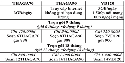 Với gói THAGA70, khách hàng sẽ có ngay 3GB tốc độ cao mỗi ngày, miễn phí truy cập tốc độ thường. Đặc biệt, khách hàng thường xuyên online sẽ không thể bỏ qua gói “TỶ PHÚ DATA” THAGA90 với dung lượng Data không giới hạn, giúp khách hàng luôn có sẵn kết nối Internet trên điện thoại mọi lúc, mọi nơi. Trường hợp khách hàng có nhu cầu liên lạc, nghe gọi nội ngoại mạng hãy chọn ngay gói VD120. Gói cước mang đến 5GB/ngày, miễn phí mỗi tháng 1.500 phút gọi nội mạng và 100 phút gọi ngoại mạng, dễ dàng “bao trọn” mọi hoạt động làm việc, giải trí trên di động.