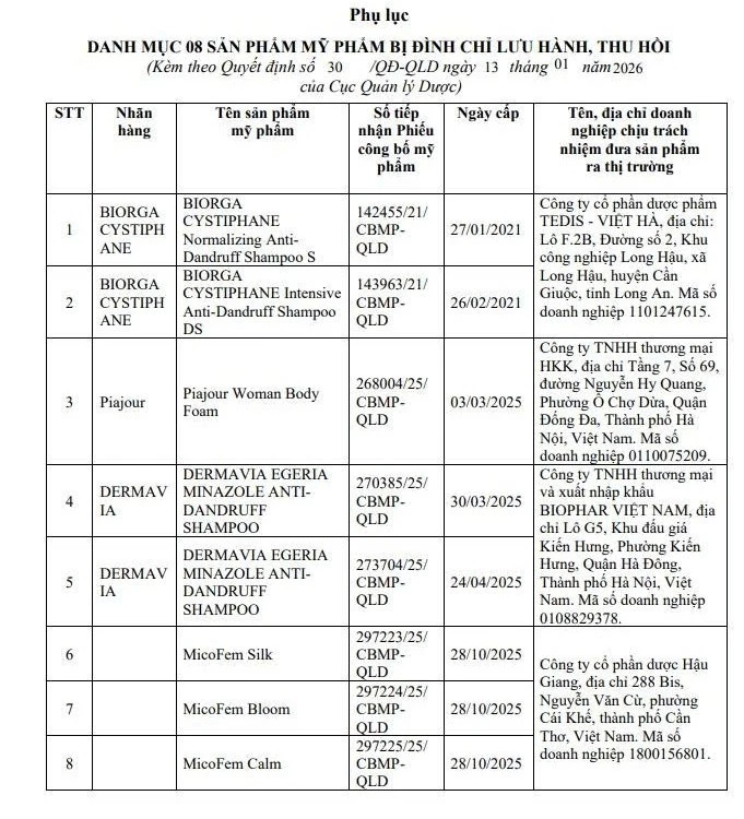 Cụ thể, đình chỉ lưu hành, thu hồi trên toàn quốc tất cả các lô còn hạn sử dụng đối với 8 sản phẩm mỹ phẩm tại Danh mục kèm theo Quyết định này, bao gồm các loại dầu gội, bọt vệ sinh và dung dịch vệ sinh phụ nữ, gồm: