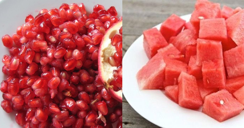 Nguyên liệu: 300 g dưa hấu + 1 quả lớn lựu đỏ tách lấy hạt, bỏ lớp màng trắng để tránh bị đắng chát + 1/2 nước cốt chanh tươi giúp giữ màu nước ép tươi lâu và tăng cường vitamin C.