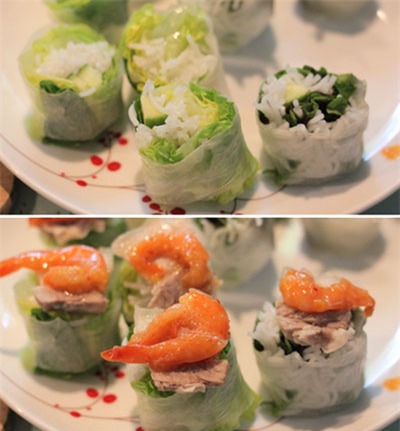Mắm tôm chua đậm đà, được cuốn cùng với bún và rau sống ăn kèm, cắt khoanh tròn dùng cho món khai vị mỗi khi nhà có tiệc vừa lạ miệng vừa hấp dẫn.