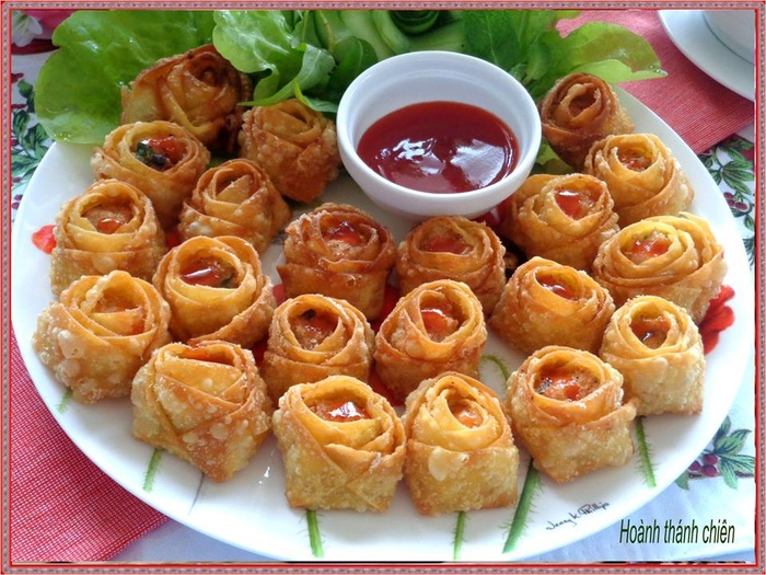 - Xếp hoành thánh hoa hồng ra đĩa, có xà lách và chén xốt tương cà. Món này ăn nóng rất giòn và ngon.