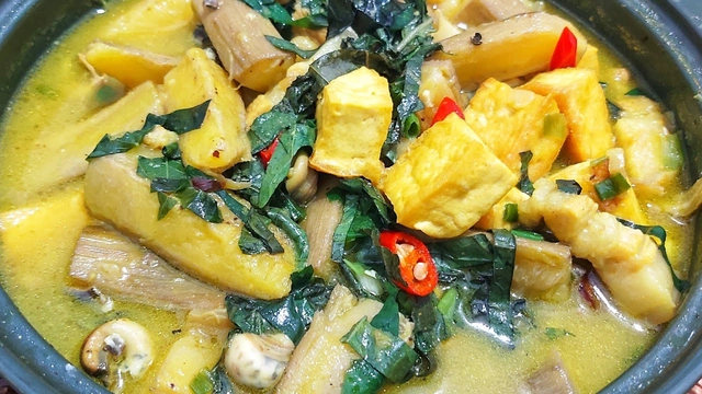 - Đổ thêm nước sao cho mực nước cao hơn mặt chuối khoảng 5cm, đợi nước sôi thì cho đậu vào, chỉnh lửa vừa, đun thêm khoảng 5 -7 phút nữa cho đậu ngấm, nêm nếm cho vừa miệng, thêm tía tô, lá lốt, hành lá vào nồi rồi tắt bếp, bắc ra, múc ra bát rồi thưởng thức luôn khi còn nóng, ăn cùng cơm hoặc bún đều rất ngon.