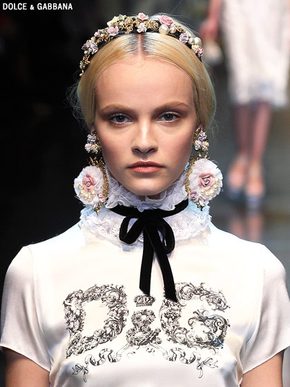 Kiểu tóc này vừa đơn giản vừa phức tạp, tinh tế, một vẻ lãng mạn mơ hồ. Nhà tạo mẫu tóc xịt keo tạo nếp cho tóc trước rồi chia ngôi giữa và uốn xoăn tóc bằng máy uốn 2,5cm. Lấy hai lọn tóc khoảng 5cm từ cả hai bên, xoắn lại ra đằng sau và cố định bằng kẹp khuy pha lê đen.
